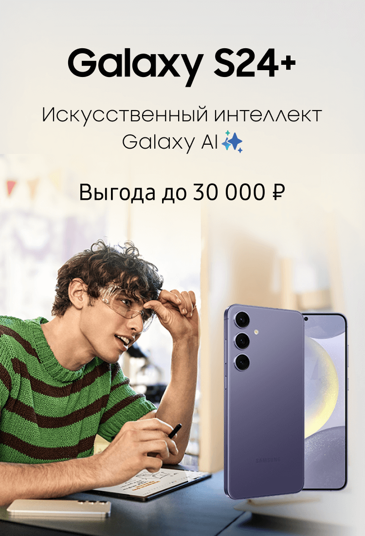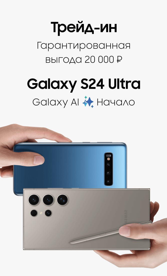 Период акции: 16.08.2024–31.10.2024. Гарантированная выгода 20 000 рублей предоставляется при покупке Galaxy S24 | S24+ и сдаче старого устройства в трейд-ин. В акции участвуют смартфоны Galaxy S24 | S24+.